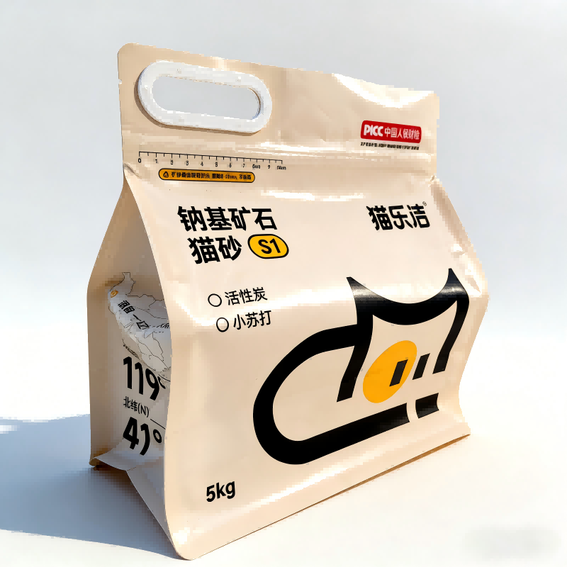 Struktura torby: Ośmiostronna struktura uszczelnienia zapewnia pionowy, stabilny kształt, idealny do ekspozycji na półce. Zamek błyskawiczny z możliwością ponownego zamknięcia i wzmocniony uchwyt z tworzywa sztucznego umożliwiają łatwe przenoszenie i bezpieczne przechowywanie 5-kilogramowego żwirku dla kota.